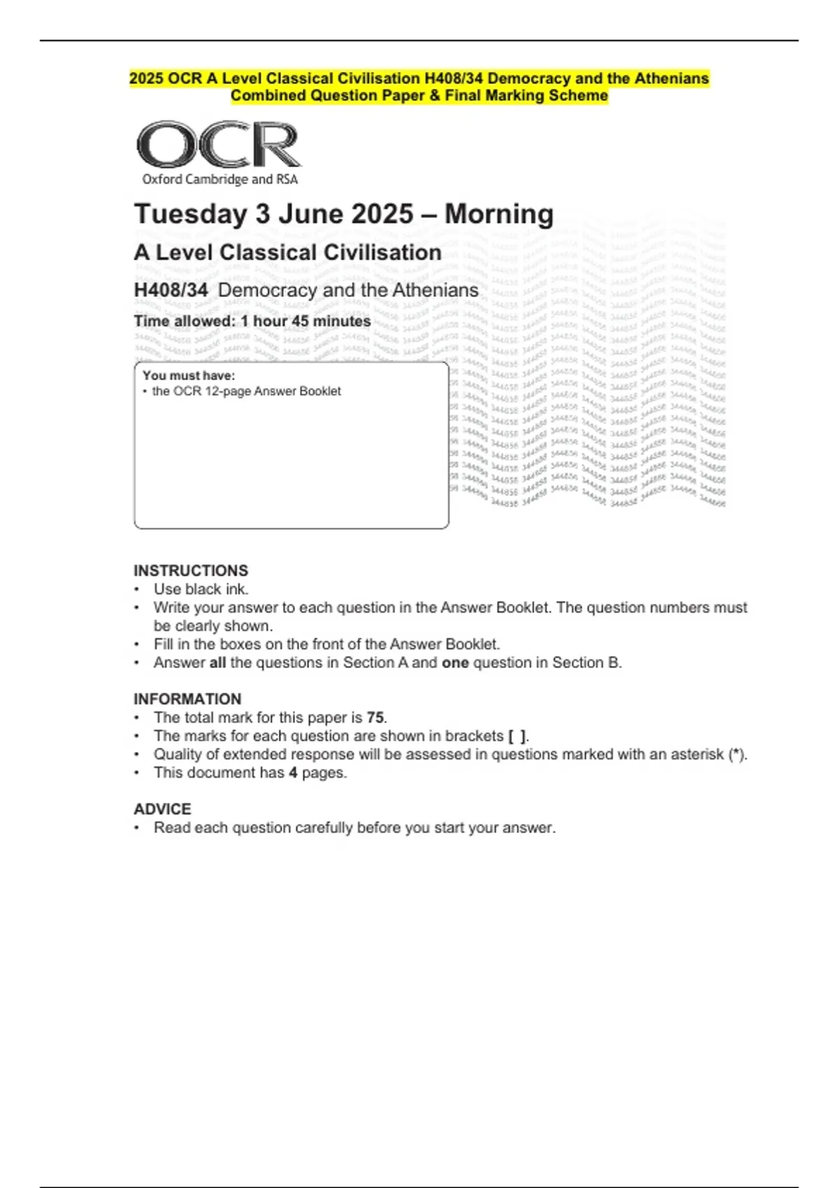 2025 OCR A Level Classical Civilisation H408/34 Democracy and the Athenians Combined Question Paper & Final Marking Scheme 2 Exam (elaborations) 2025 OCR A Level Classical Civilisation H408/33 Politics of the Late Republic Combined Question Paper & Final Marking Scheme 3 Exam (elaborations) 2025 OCR A Level Classical Civilisation H408/32 Love and