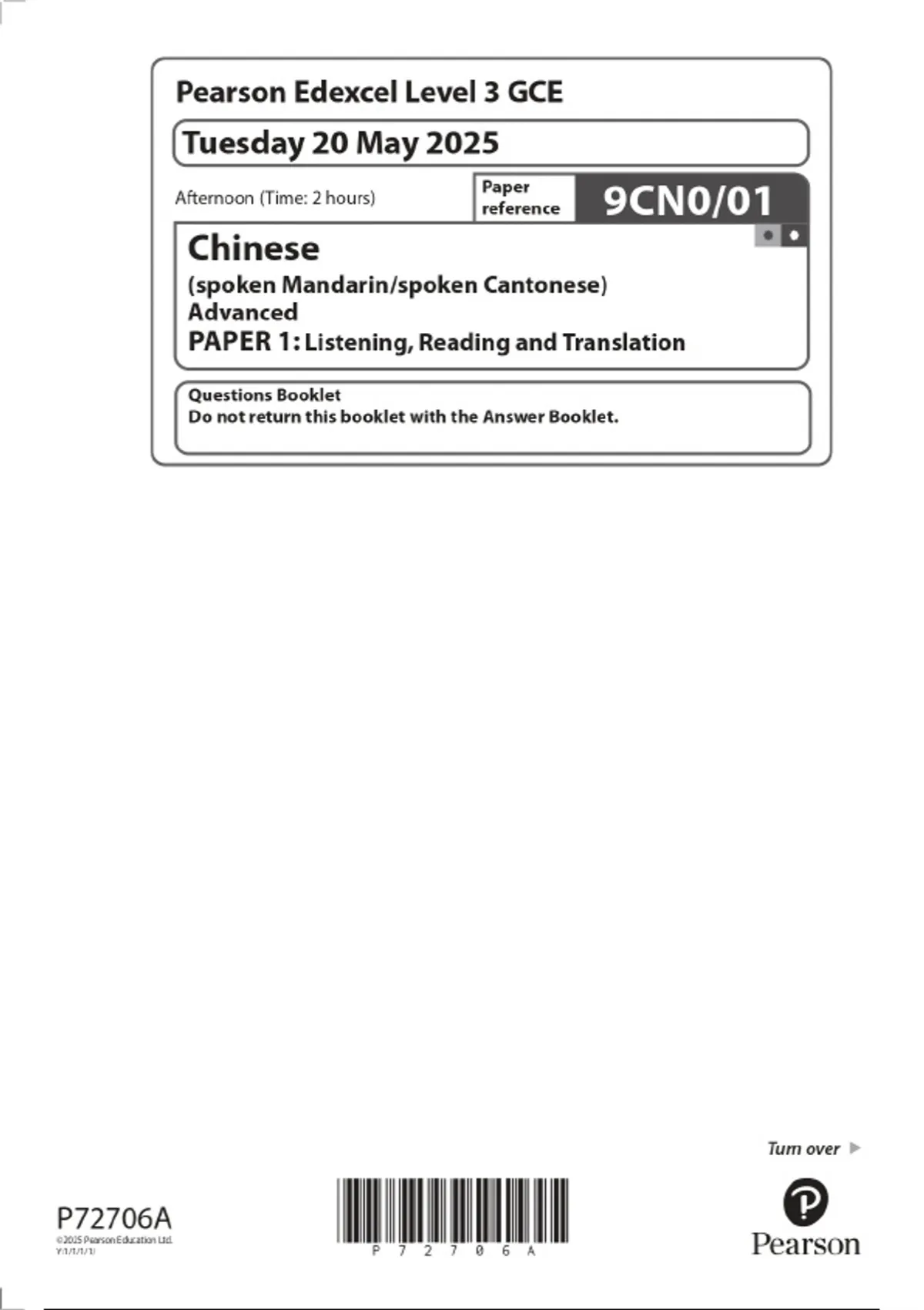 2025 Pearson Edexcel Level 3 GCE Chinese (spoken Mandarin/spoken Cantonese) Advanced PAPER 2: Written response to works and translation Combined Question Paper and Final Marking Scheme 2 Exam (elaborations) 2025 Pearson Edexcel Level 3 GCE Chinese (spoken Mandarin/spoken Cantonese) Advanced PAPER 1: Listening, Reading and Translation Combined Ques