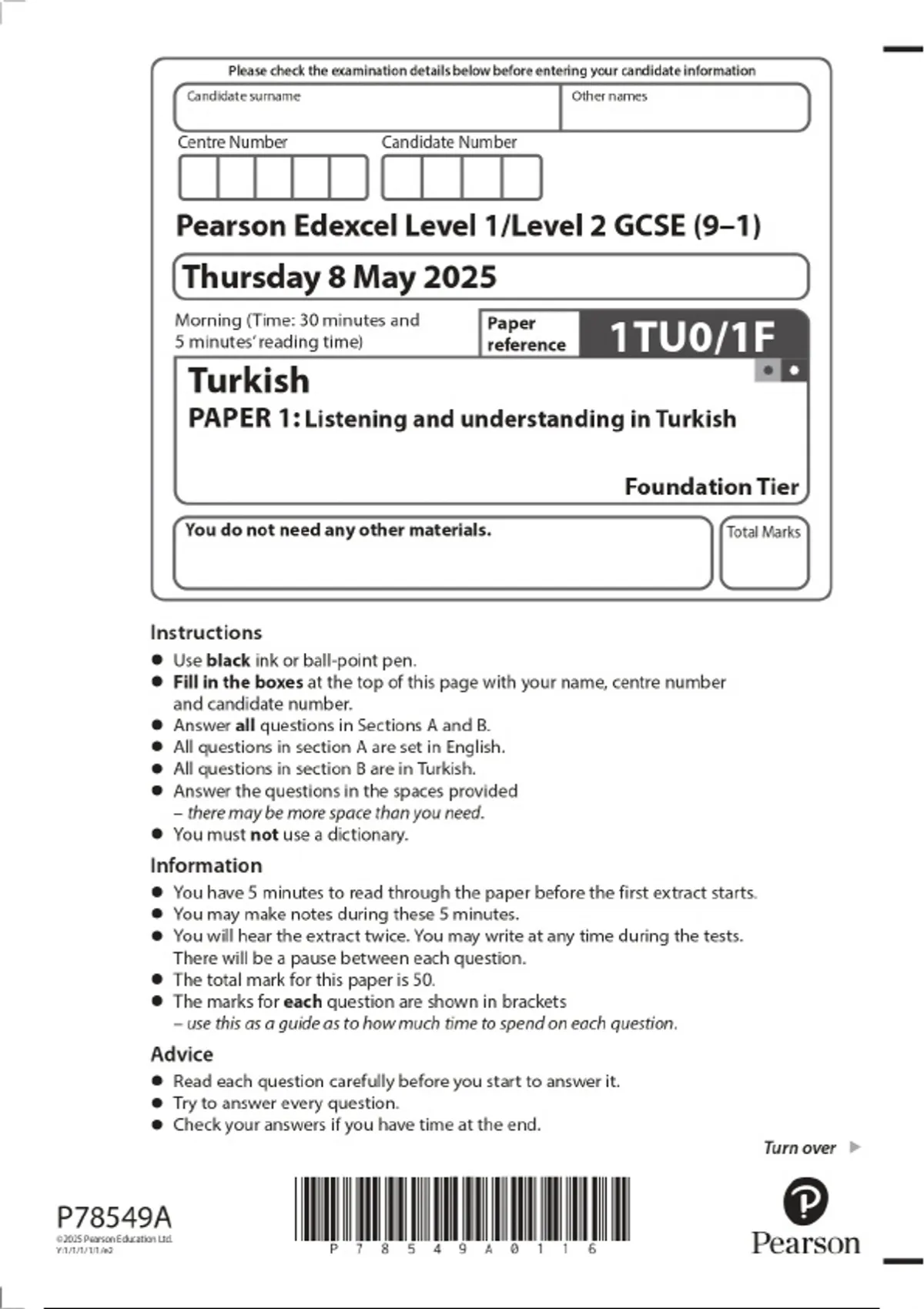 2025 Pearson Edexcel Level 1/level 2 GCSE (9-1) Turkish Paper 1: Listening and understanding in Turkish Higher Tier Combined Question Paper and Final Marking Scheme 3 Exam (elaborations) 2025 Pearson Edexcel Level 1/level 2 GCSE (9-1) Turkish PAPER 3: Reading and understanding in Turkish Foundation Tier Combined Question Paper and Final Marking Sc
