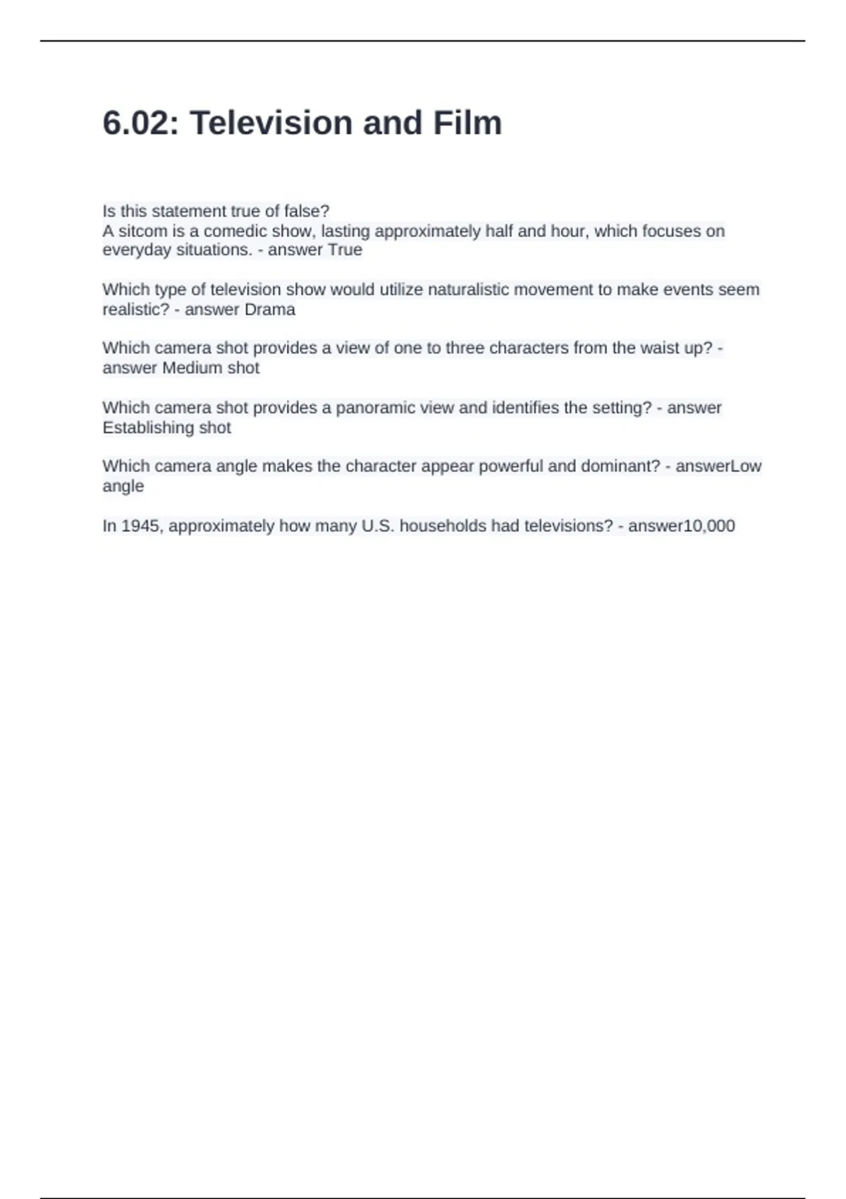 Exam (elaborations) week 1- intro to film quiz questions with correct answers Exam (elaborations) Intro To Film Questions with Accurate Answers Exam (elaborations) Intro to Film Studies Questions and Answers 100% Solved Exam (elaborations) intro to film- quiz 1. questions with solutions Exam (elaborations) Intro To Film Final Exam. Questio