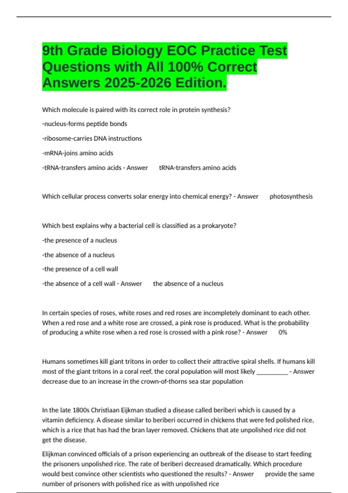 1 Exam (elaborations) Biology NC EOC Review Test Assessments All Solved Correct Graded A+ Edition. 2 Exam (elaborations) Biology EOC Practice-Honors Test Questions and Answers All Correct Updated. 3 Exam (elaborations) Biology EOC study guide Questions All Answered Correct Set.