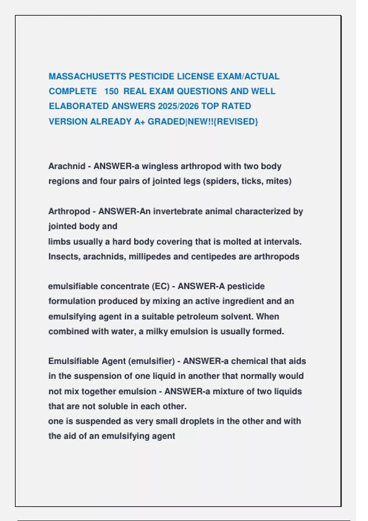 MASSACHUSETTS PESTICIDE LICENSE EXAM/ACTUAL COMPLETE 150 REAL EXAM QUESTIONS AND WELL ELABORATED ANSWERS 2025/2026 TOP RATED VERSION ALREADY A+ GRADED|NEW!!{REVISED} Massachusetts Pesticide License Exam study guide, Most Recent 2025/2026 Actual Complete Real Exam Questions And Verified Answers | 100% Correct Answers Graded A+ / Guaranteed Success!!