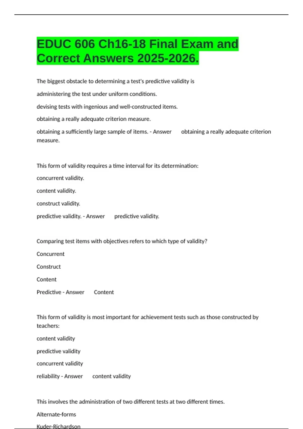 1 Exam (elaborations) EDUC 606 Week 4 Questions and Answers. 2 Exam (elaborations) EDUC 606 Test Questions and Answers. 3 Exam (elaborations) EDUC 606 Study Guide Questions And All Correct Answers Edition.