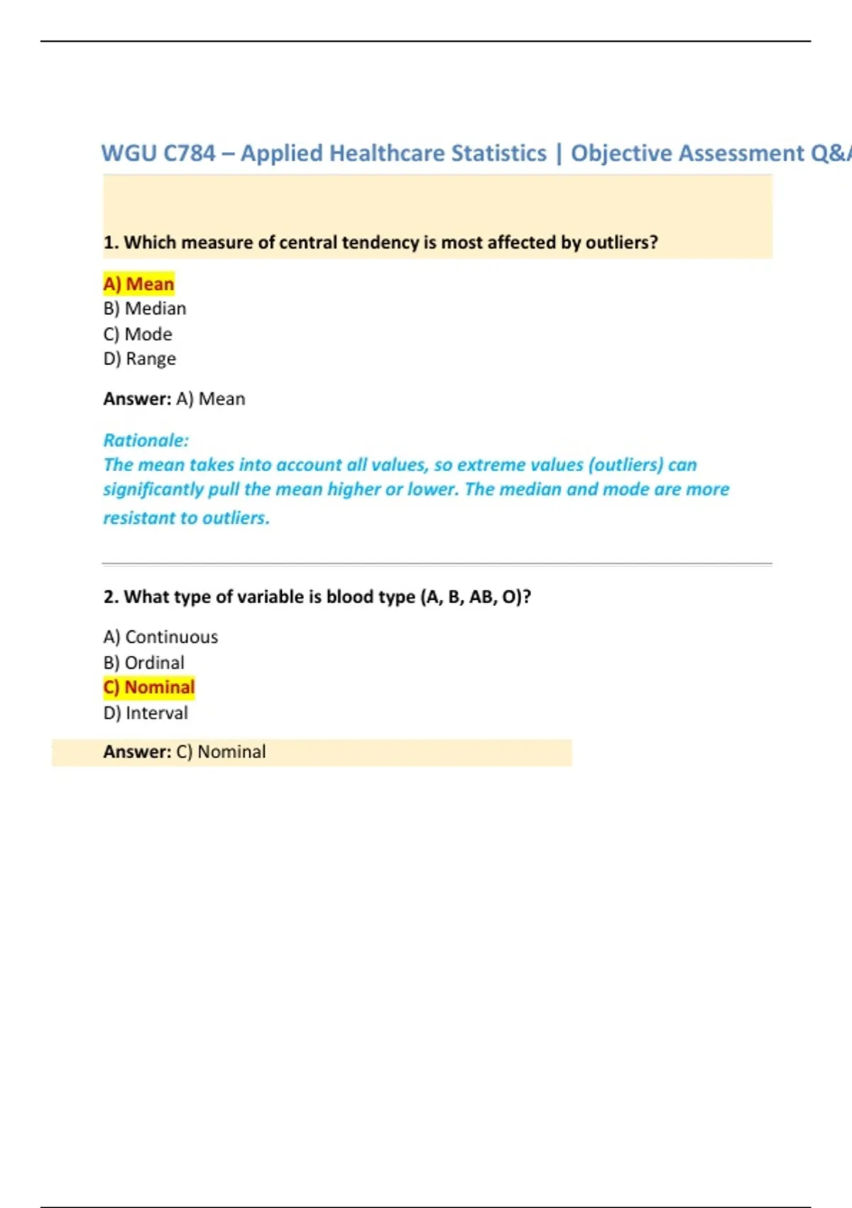 Full WGU C784 exam pack covering applied healthcare statistics with verified A+ answers. Includes multiple OA versions and practical questions for guaranteed exam success.