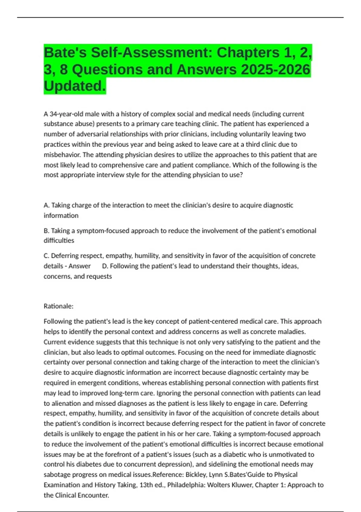 1 Exam (elaborations) Physical Assessment - Final Exam (Bates) Questions and All Correct Answers Updated. 2 Exam (elaborations) Chapter 20- The Older Adult Bates Test Bank Questions and Correct Answers Updated. 3 Exam (elaborations) Chapter 9 Bates Test Questions All Answered Correct Updated.