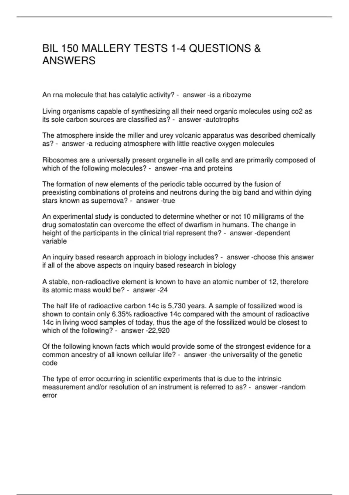 BIL 150 MALLERY TESTS 1-4 QUESTIONS & ANSWERS 2 Exam (elaborations) BIL 150 EXAM 1 QUESTIONS & ANSWERS 3 Exam (elaborations) BIL 150 FINAL EXAM-MALLERY QUESTIONS 4 Exam (elaborations) BIL 150 - VAN DYKEN (EXAM 1) 5 Exam (elaborations) BIL 150 FINAL EXAM VAN DYKEN QUESTIONS & ANSWERS 6 Exam (elaborations) BIL 150 EXAM 1 QUESTIONS & ANSWERS 7 E
