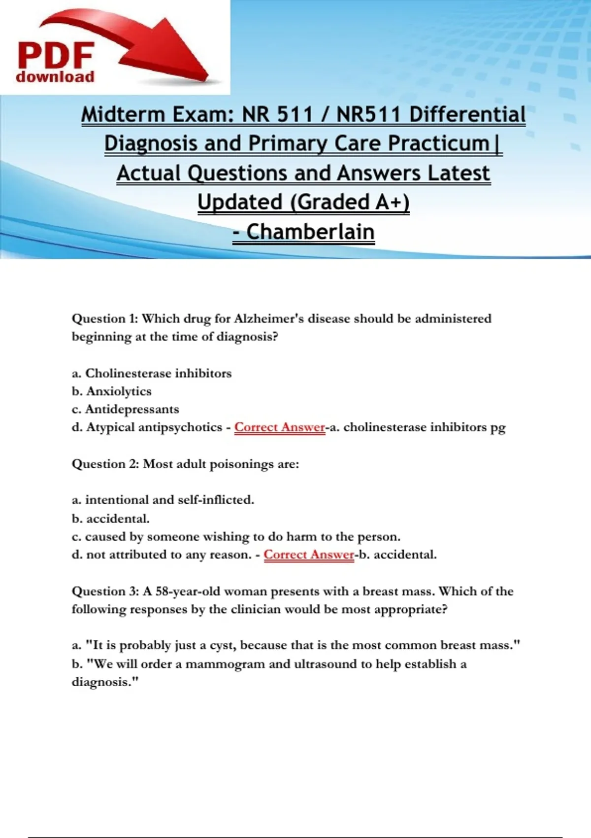 Midterm Exam: NR 511 / NR511 Differential Diagnosis and Primary Care Practicum | Actual Questions and Answers Latest Updated 2025/2026 (Graded A+)– Chamberlain Midterm Exam: NR 511 / NR511 Differential Diagnosis and Primary Care Practicum | Actual Questions and Answers Latest Updated 2025/2026 (Graded A+)– Chamberlain Midterm Exam: NR 511 / NR511 D