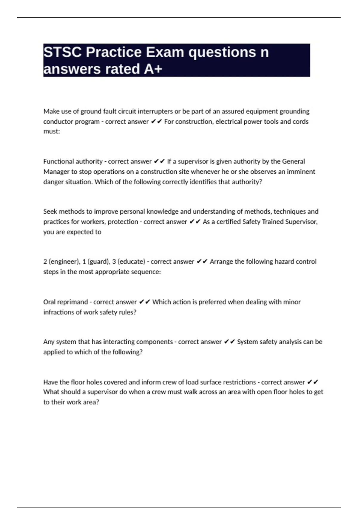 1 Exam (elaborations) STSC questions well answered to pass 2 Exam (elaborations) STSC Study Guide questions well answered 3 Exam (elaborations) STSC Final Exam questions with verified answers rated A+ 4 Exam (elaborations) STSC Drill Test questions with correct answers 5 Exam (elaborations) STSC Practice Quizzes with correct answers rated A+