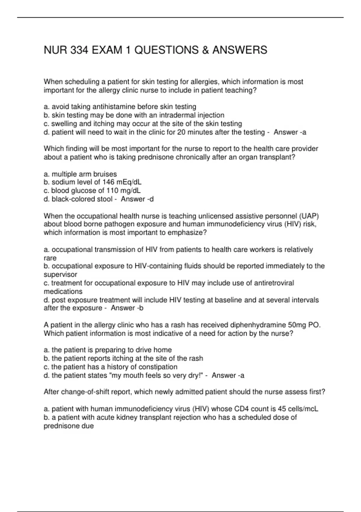 NUR 334 EXAM 1 QUESTIONS & ANSWERS 2 Exam (elaborations) NUR 334 EXAM 1 QUESTIONS AND ANSWERS 3 OTHER UMAINE NUR 334 EXAM 1 STUDY GUIDE 4 OTHER NUR 334 EXAM 3 STUDY GUIDE 5 Exam (elaborations) NUR 334 PHARMACOLOGY I MODULES 7 AND 8 EXAM 4 TERMS (REPRODUCTIVE, GI, MUSCULOSKELETAL) 6 Exam (elaborations) NUR 334 EXAM 3 PHARMACOLOGY QUESTIONS 7 E