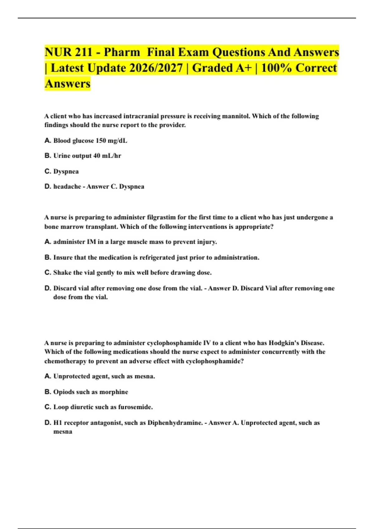 NUR 211 FINAL EXAM QUESTIONS AND CORRECT ANSWERS LATEST UPDATE, NUR 211 Week 6 Exam, NUR 211 Midterm Exam & NUR 211 - Pharm Final Exam Questions And Answers | Latest Update 2026/2027 | Graded A+ | 100% Correct Answers