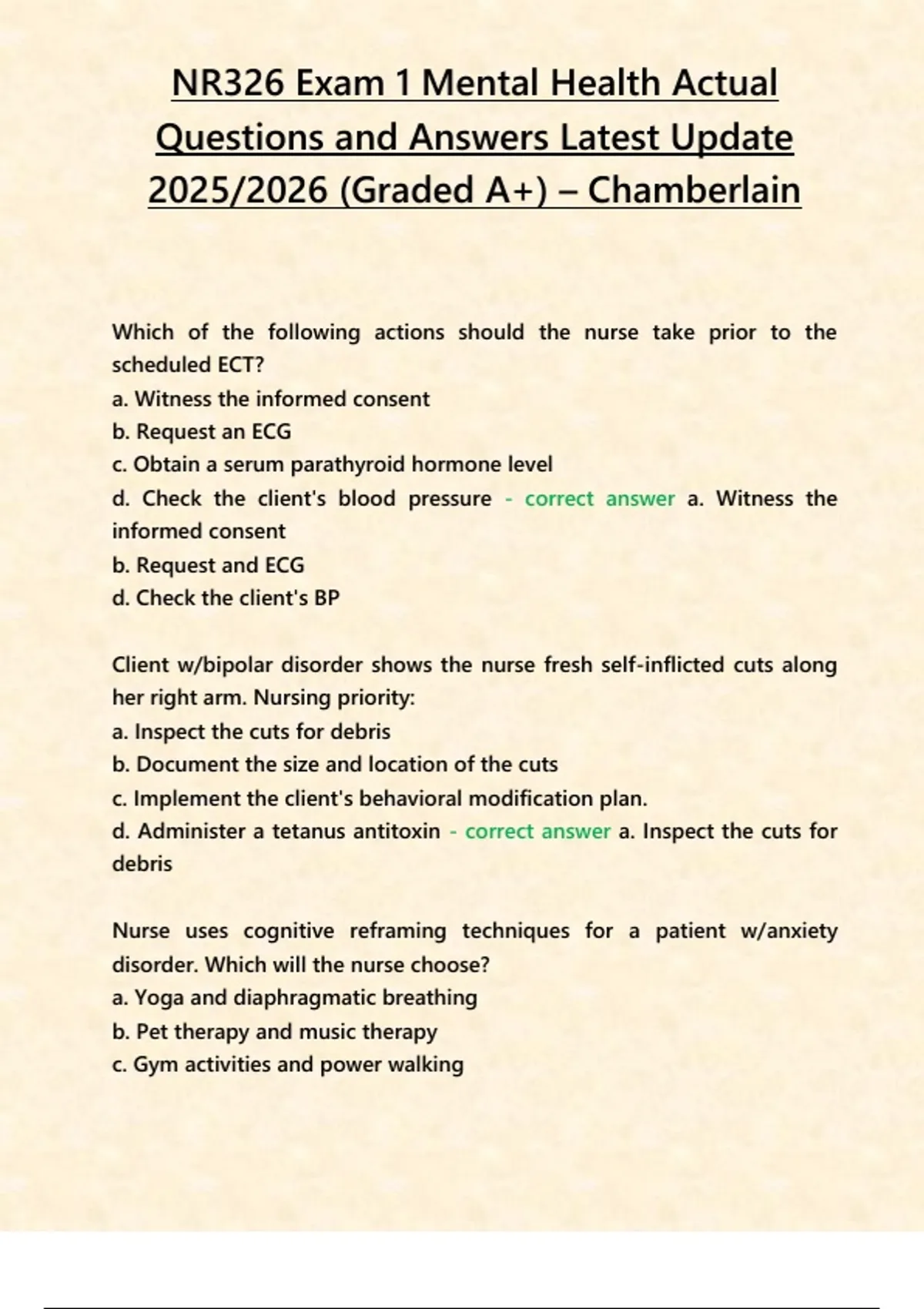 Exam 1: NR326 / NR 326 (Latest 2025 / 2026 Updates STUDY BUNDLE PACKAGE WITH SOLUTIONS) Mental Health Nursing | Questions & Answers | Grade A | 100% Correct (Verified Solutions) - Chamberlain