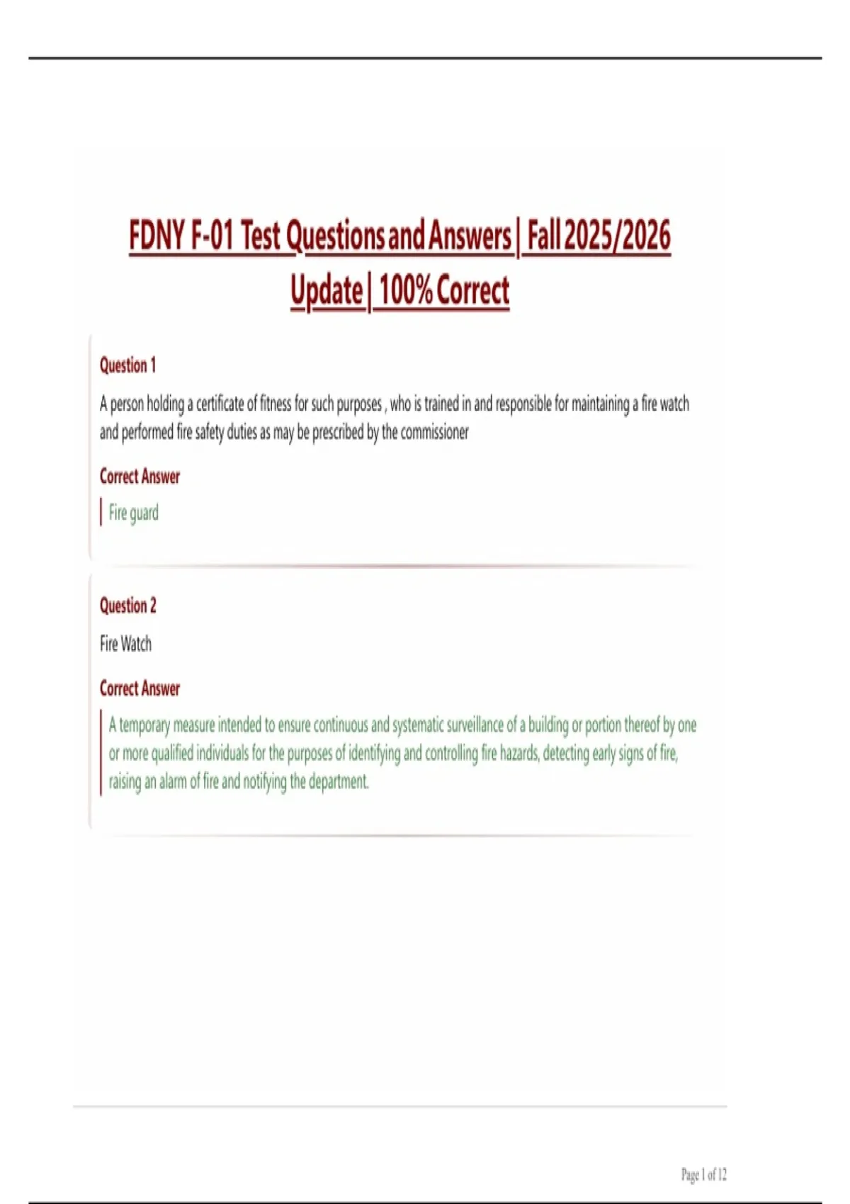 FDNY F-01 Test Questions and Answers | Fall 2025/2026 Update | 100% Correct