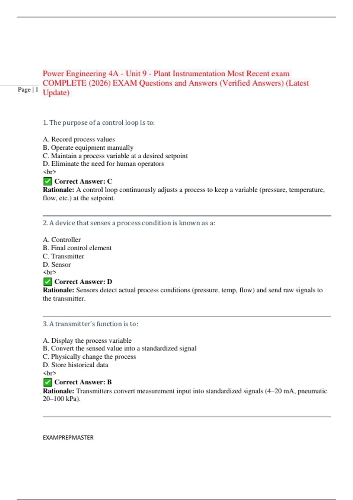 Exam (elaborations) Power Engineering 4A – Unit 9: Plant Instrumentation Exam – Most Recent Study Guide & Practice QuestionsThis Power Engineering 4A Unit 9 study guide covers plant instrumentation, including control systems, sensors, safety devices, and monitoring procedure 2 Exam (elaborations) Power Engineering 4A – Unit 9: Plant Instrumentatio