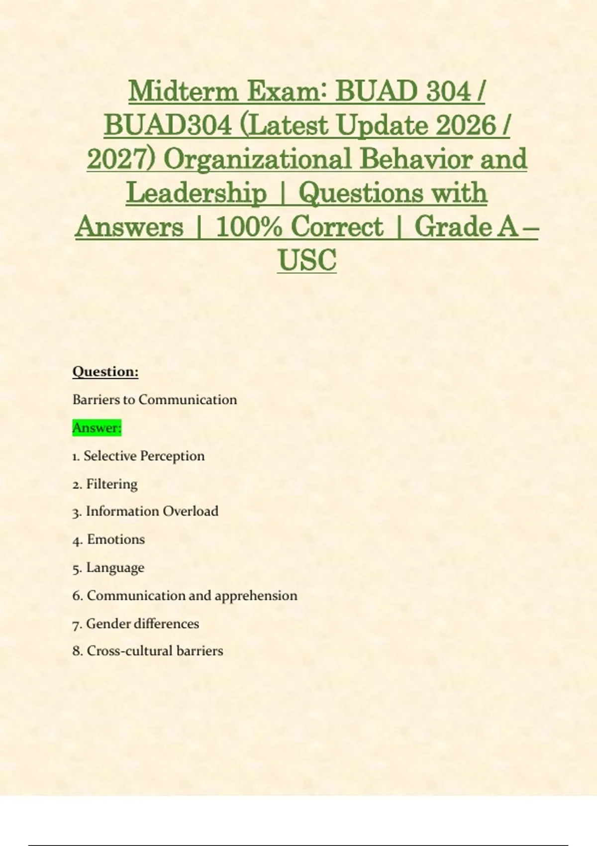 Midterm Exam: BUAD304 / BUAD 304 (Latest Update 2026 / 2027) Organizational Behavior and Leadership | Questions with Answers | Grade A | 100% Correct – USC
