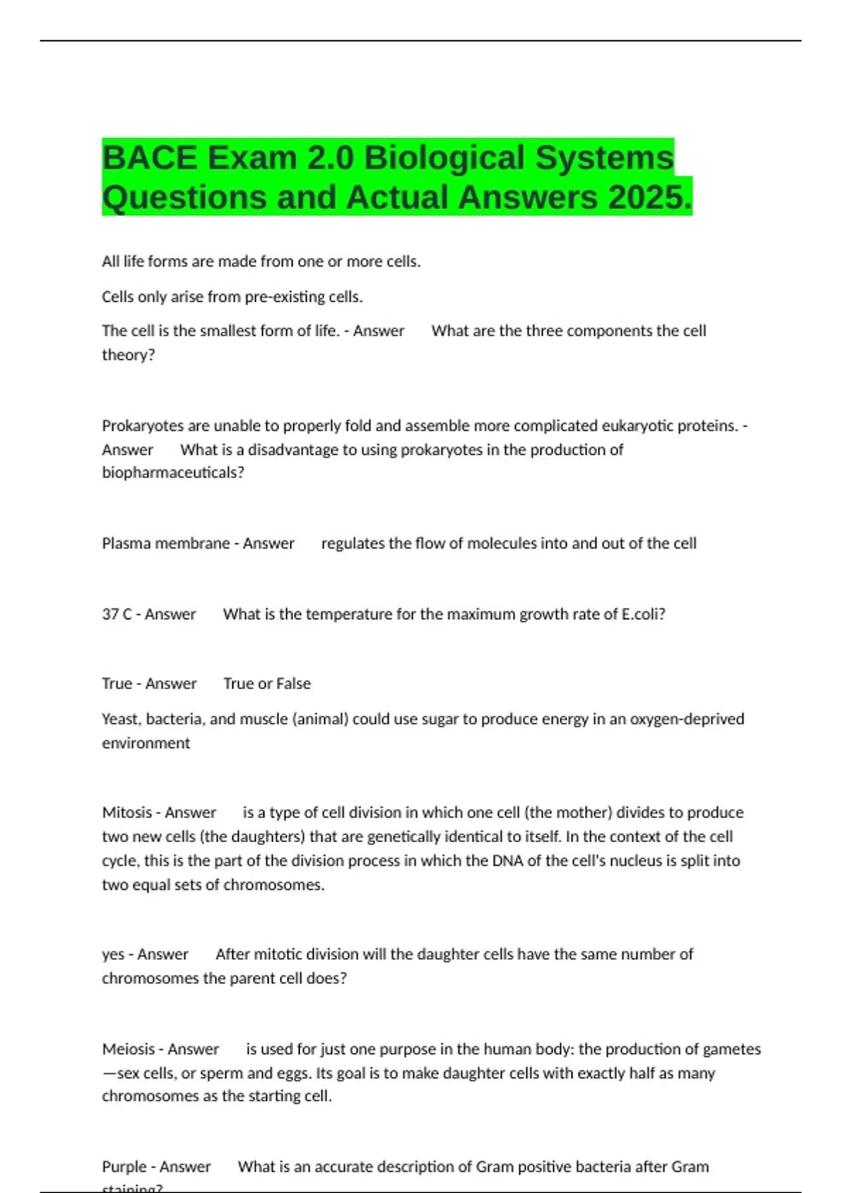 1 Exam (elaborations) FTCE Biology 6-12 Sample Test Questions and All Correct Answers Updated. 2 Exam (elaborations) BACE Practice Quiz 5 Biotechnology Skills and All Correct Answers . 3 Exam (elaborations) BACE Practice Quiz 5 Biotechnology Skills and All Correct Answers .