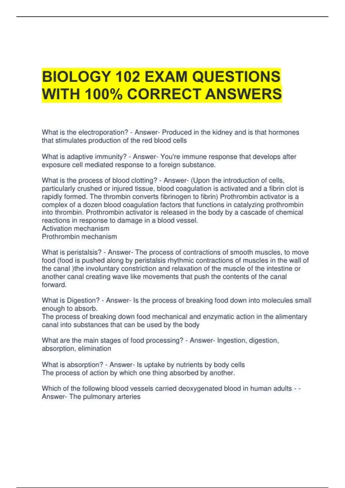 BIOLOGY 102 EXAM QUESTIONS WITH 100% CORRECT ANSWERS 2 Exam (elaborations) BIOLOGY 102 EXAM 3 QUESTIONS AND ANSWERS ALL CORRECT 3 Exam (elaborations) BIOLOGY 102 FINAL EXAM QUESTIONS AND ANSWERS 4 Exam (elaborations) Biology 102 Study Test Questions with 100% Correct Answers 5 Exam (elaborations) BIOLOGY 102 TEST QUESTIONS AND ANSWERS 6 Exam (