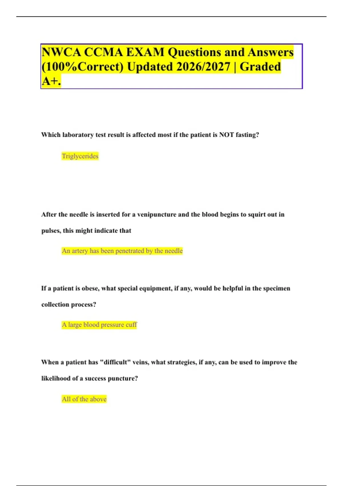 NWCA CET TEST Questions and Answers | NWCA Medical Assistant Exam Questions and Answers | NWCA CCMA EXAM Questions and Answers & NWCA TEST Questions and Answers (100%VERIFIED) Latest Update 2026/2027 Graded A+.