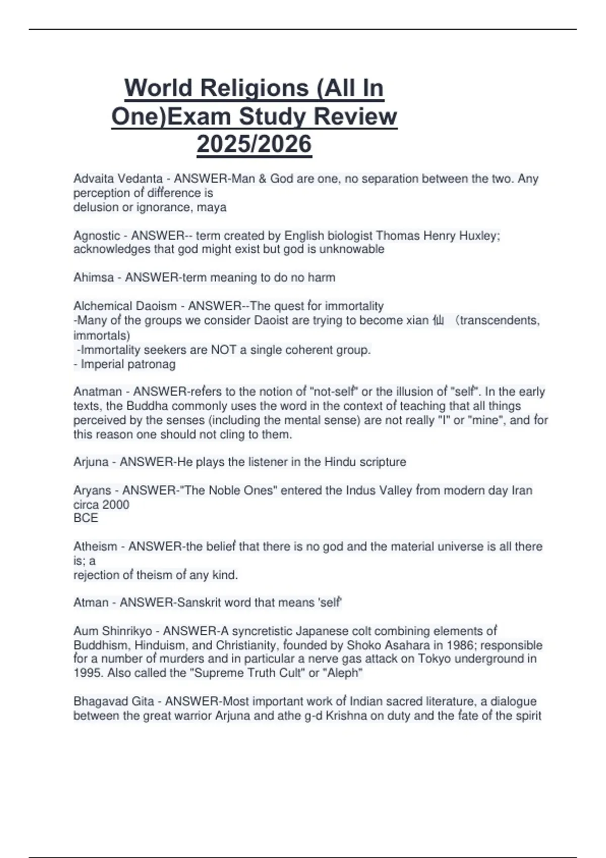 Latest Version (World Religions All In One) Exam Study Guide Questions And Accurate Answers 2025/2026 World Religions Test Exam Questions And Verified Answers 2025/2026(All In One) (100% Guaranteed Pass)World Religions (All In One) Test Questions And Answers 2025/2026 DSST (Intro To World Religions All In One)2025/2026 Exam Questions And Answers