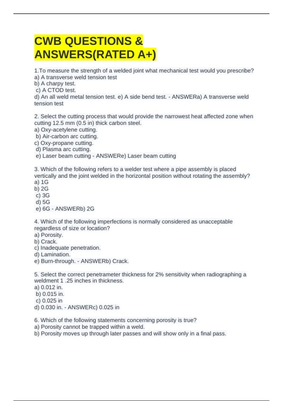 CWB QUESTIONS & ANSWERS(RATED A+) COMPLETE EXAM BUNDLE