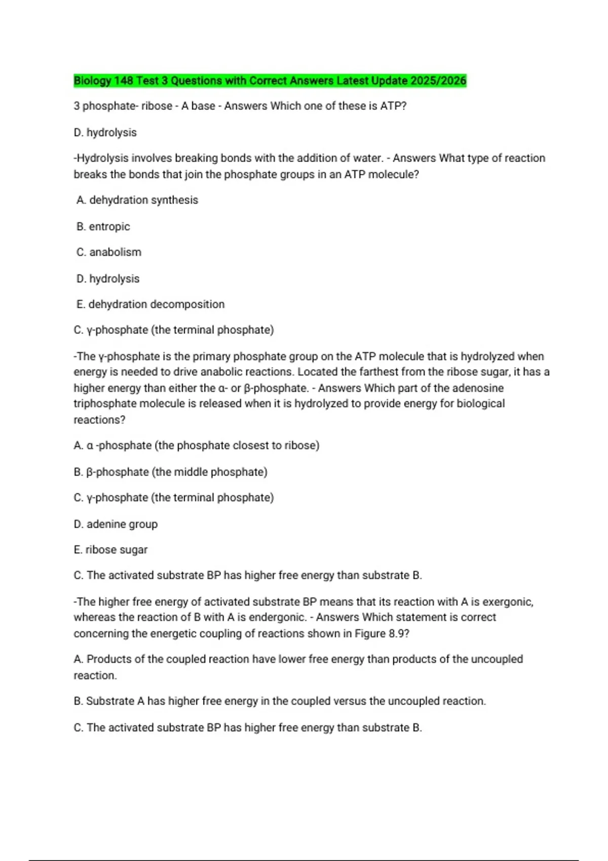 Biology 148 Test 3 Questions with Correct Answers Latest Update 2025/2026