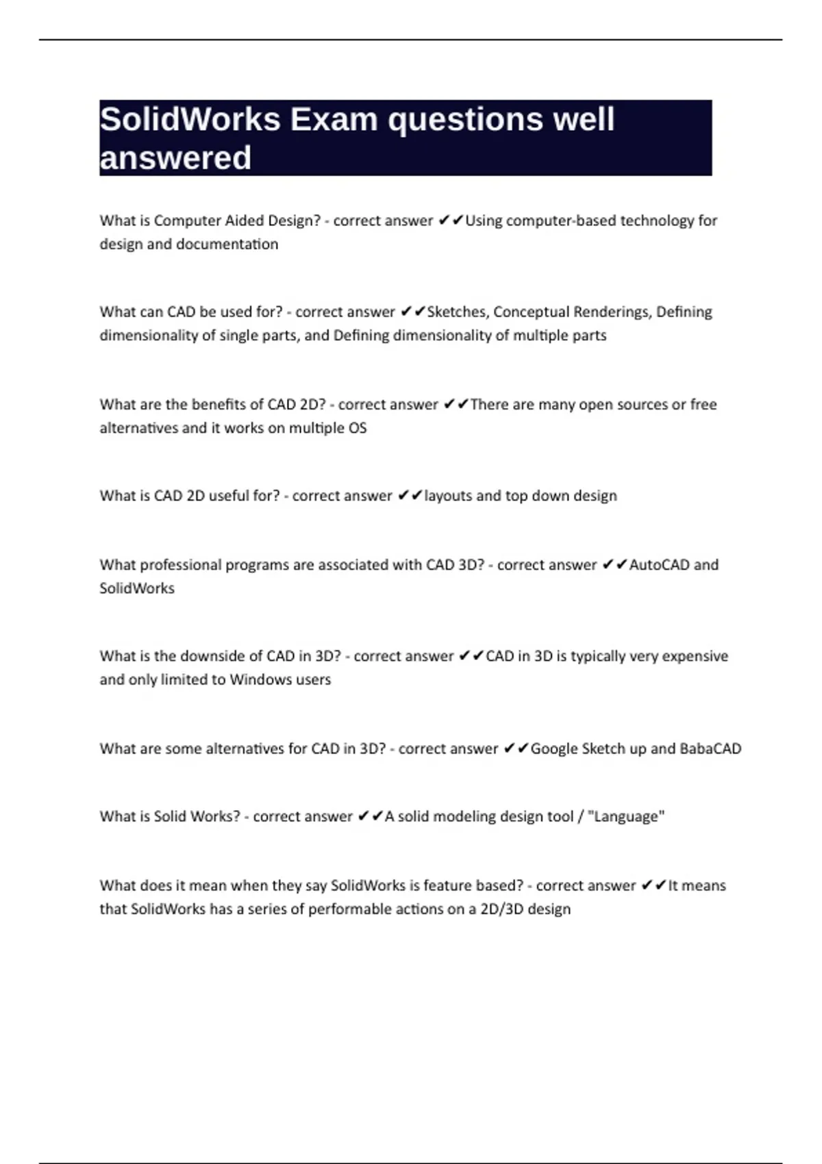 1 Exam (elaborations) SOLIDWORKS Associate Exams 1-30 with verified answers 2 Exam (elaborations) SOLIDWORKS CERTIFICATION questions well answered graded A+ 3 Exam (elaborations) SolidWorks Quiz 1 with verified answers already passed 4 Exam (elaborations) SOLIDWORKS Simulations questions well answered to pass 5 Exam (elaborations) SolidWorks; S