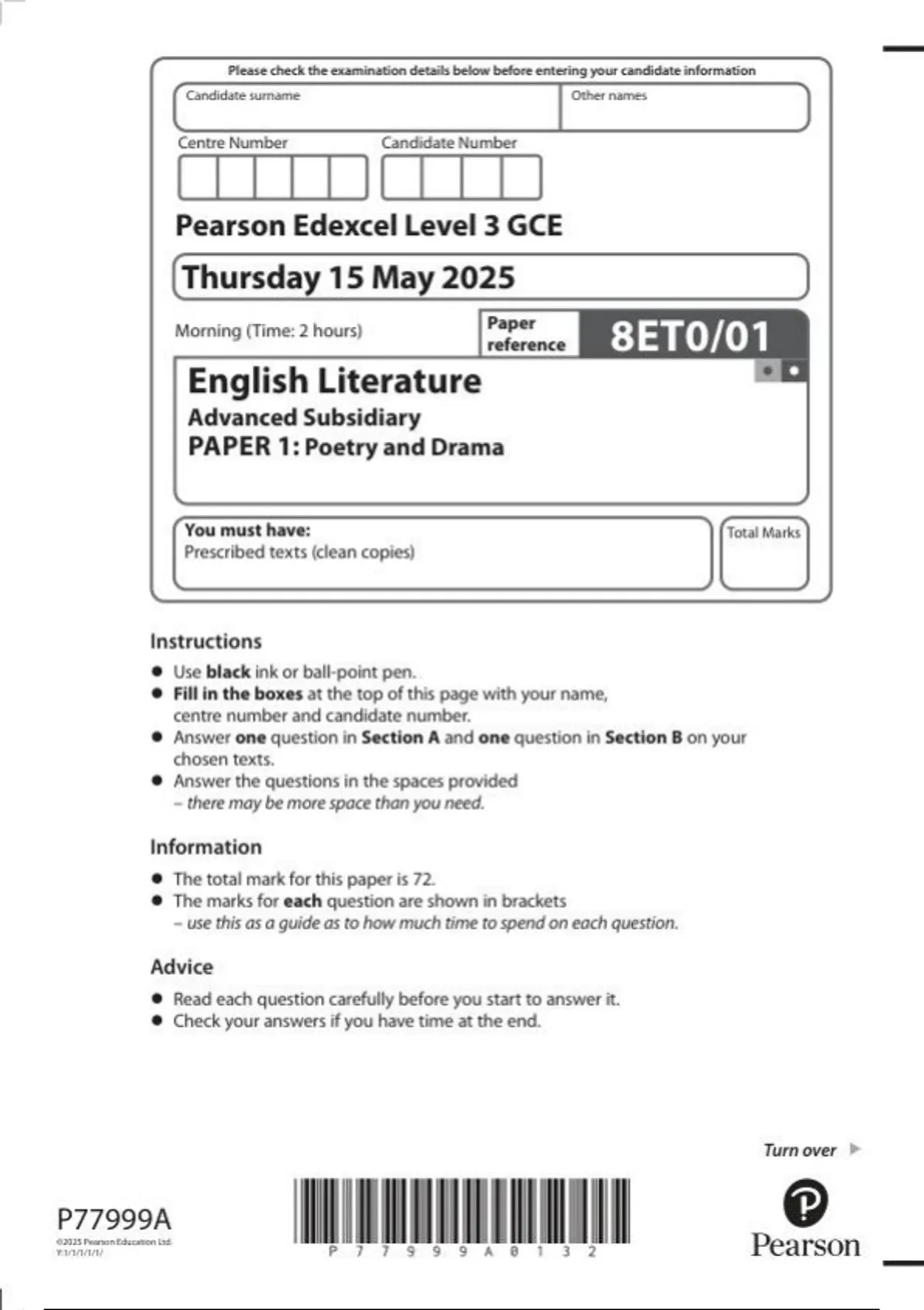 Pearson Edexcel Level 3 GCE 8ET0/01 English Literature Advanced Subsidiary PAPER 1: Poetry and Drama Question paper June 2025
