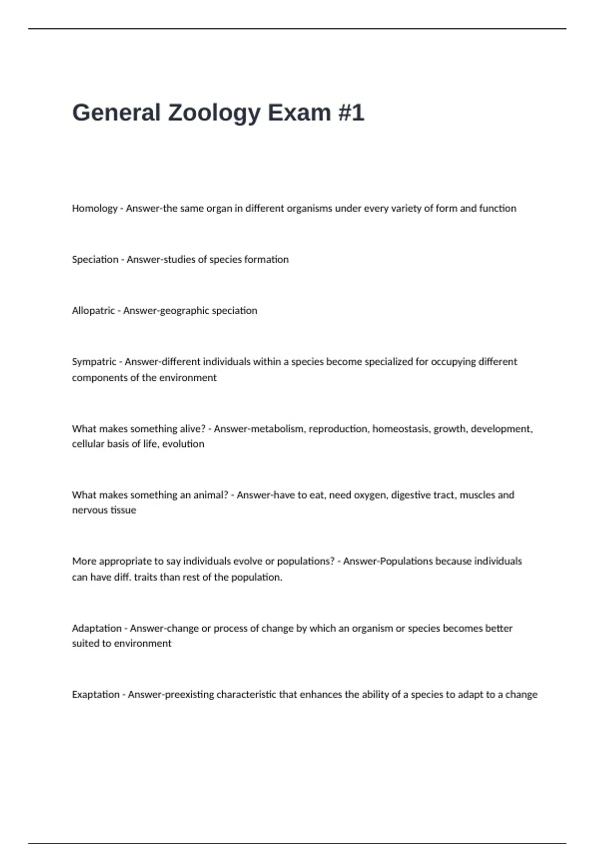 General Zoology Exam -1 Questions and Answers,General Zoology Final Exam Questions and Answers,General Zoology, Exam 1 Questions and Answers (classification, body plans, terms),TXST Zoology Exam 1 Questions with Correct Answers,Vertebrate Zoology Exam Questions and Answers,Zoology 101, UW Madison, EXAM 1 Questions with Correct Answers.