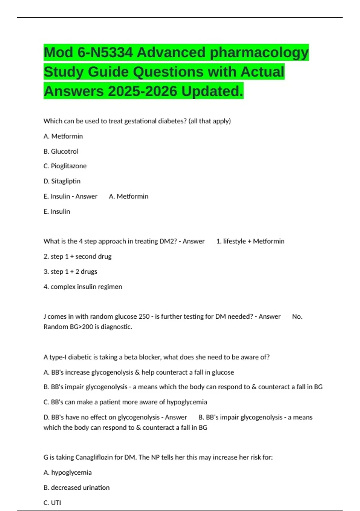 1 Exam (elaborations) Test 2 N5334 Advanced Pharmacology Latest Exam and All Correct Answers Updated. 2 Exam (elaborations) Module 12- Pharmacology Questions and Answers. 3 Exam (elaborations) Module 12- Emergency Procedures Quizzes and Answers .