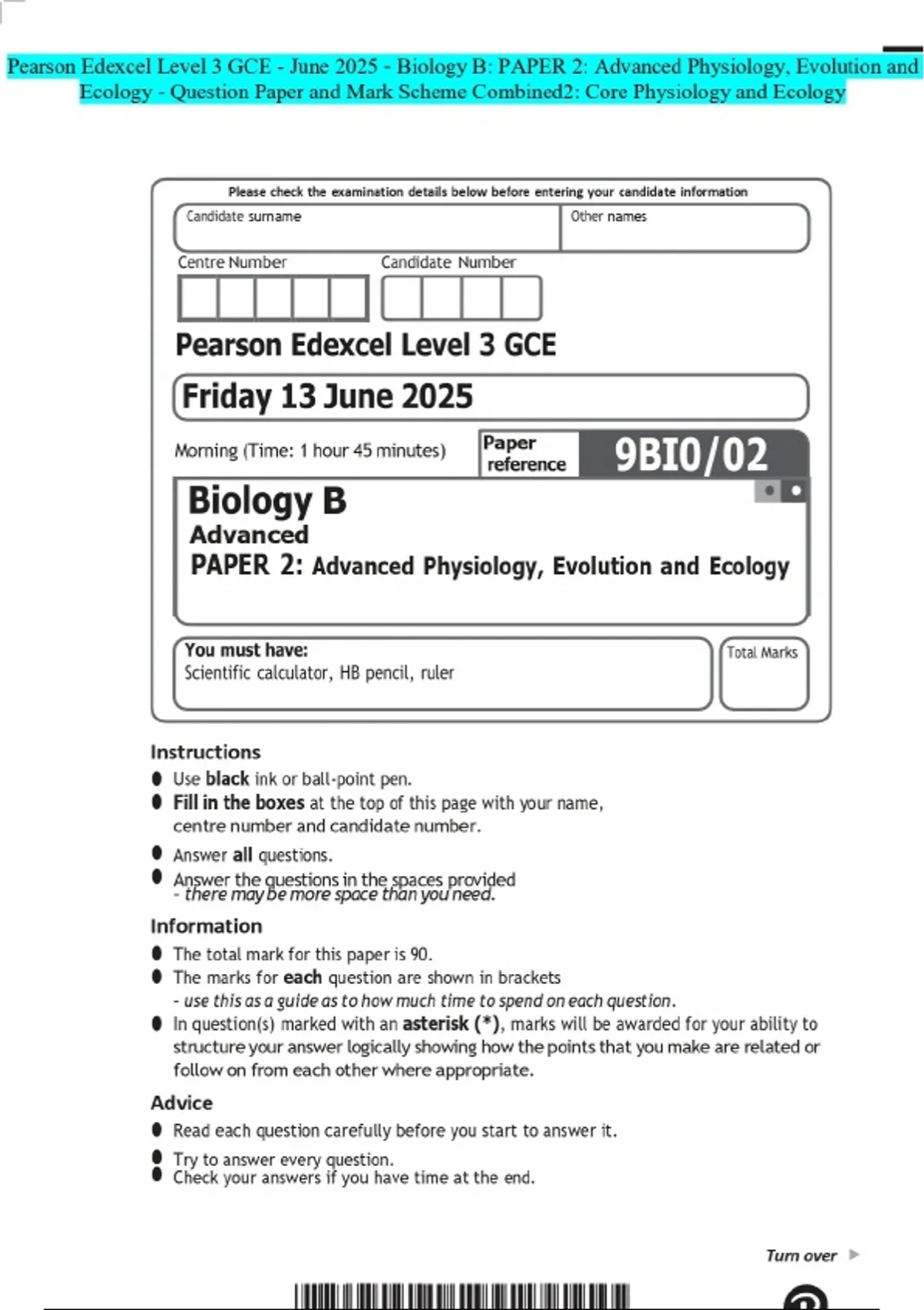 Pearson Edexcel Level 3 GCE - June 2025 - Biology B: PAPER 2: Advanced Physiology, Evolution and Ecology - Question Paper and Mark Scheme Combined2