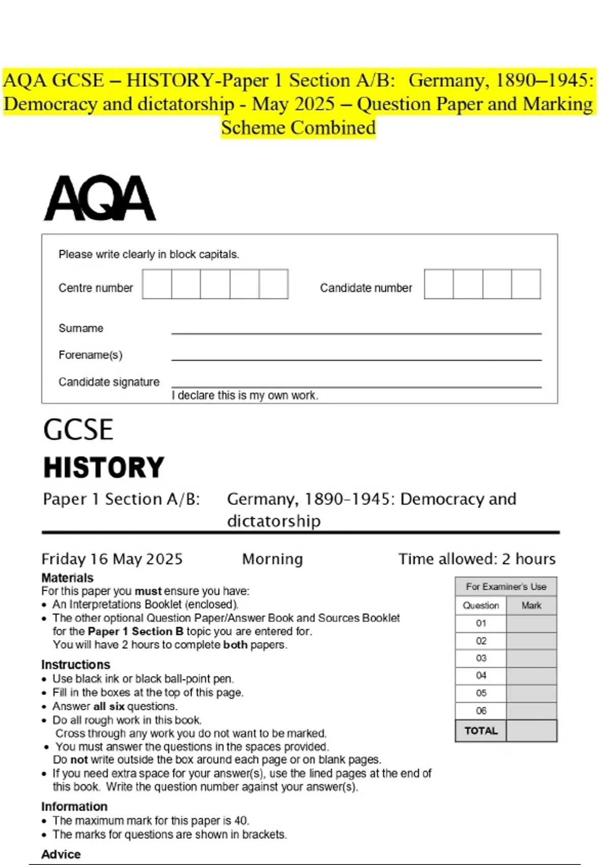 AQA GCSE - HISTORY-Paper 1 Section A/B: Germany, : Democracy and dictatorship - May 2025 – Question Paper and Marking Scheme Combined