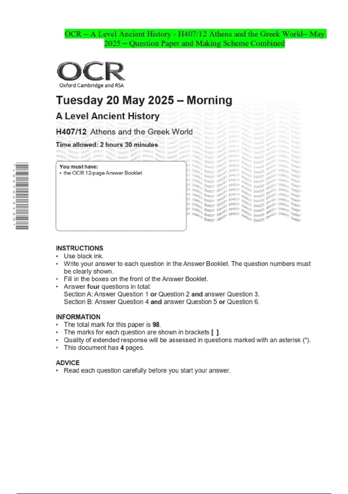 OCR AS Level Ancient History - H007/01 Relations between Greek states and between Greek and non‑Greek states, 492–404 BC- May 2025 – Question Paper and Making Scheme Combine