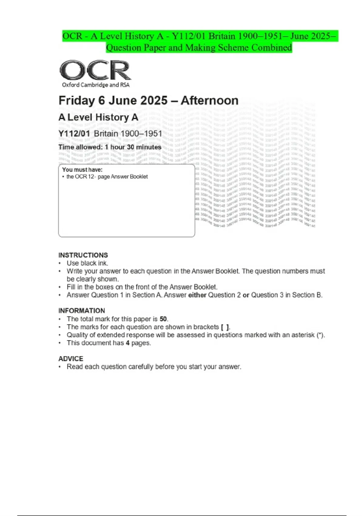 OCR - A Level History A - Y112/01 Britain - June 2025- Question Paper and Making Scheme Combined