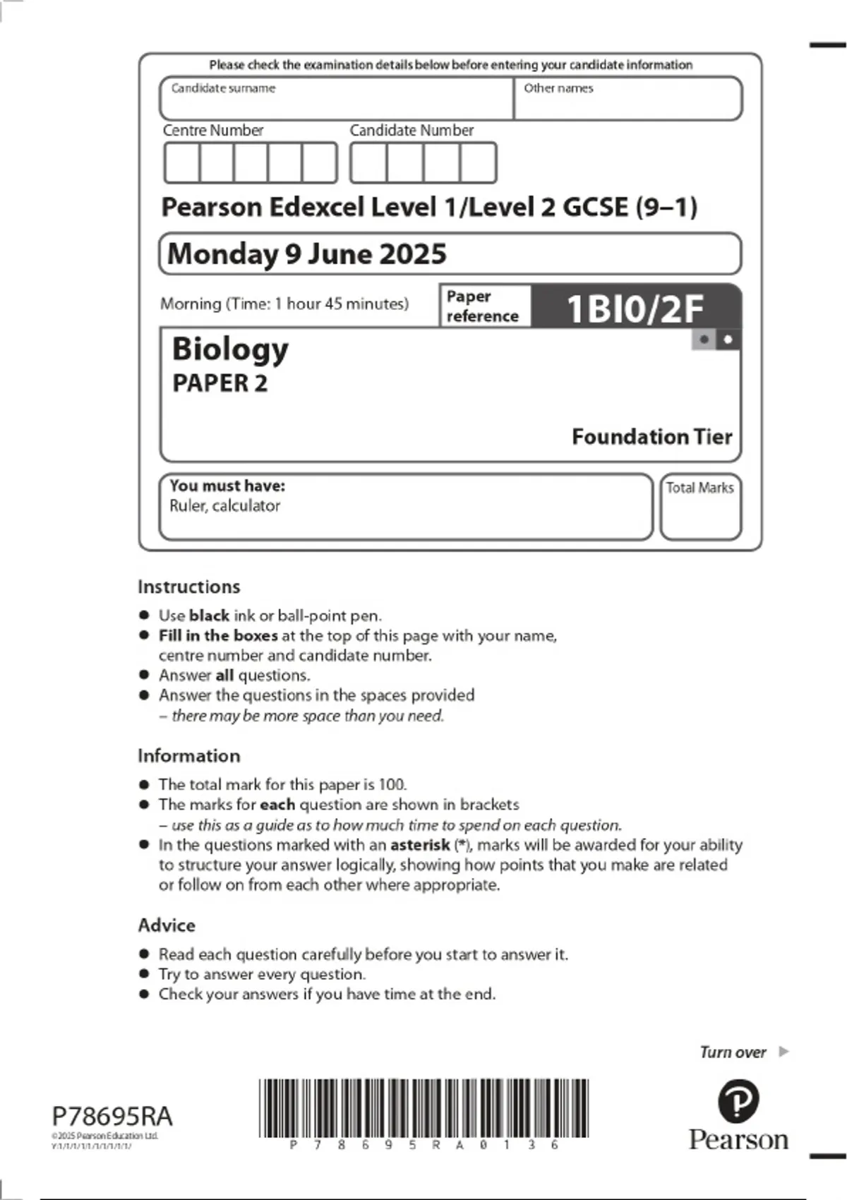 2025 Pearson Edexcel Level 1/Level 2 GCSE (9–1) Biology PAPER 2 Foundation Tier Combined Question Paper and Final Marking Scheme 2 Exam (elaborations) 2025 Pearson Edexcel Level 1/Level 2 GCSE (9–1) Biology PAPER 2 Higher Tier Combined Question Paper and Final Marking Scheme 3 Exam (elaborations) 2025 Pearson Edexcel Level 1/Level 2 GCSE (9–1) Bi