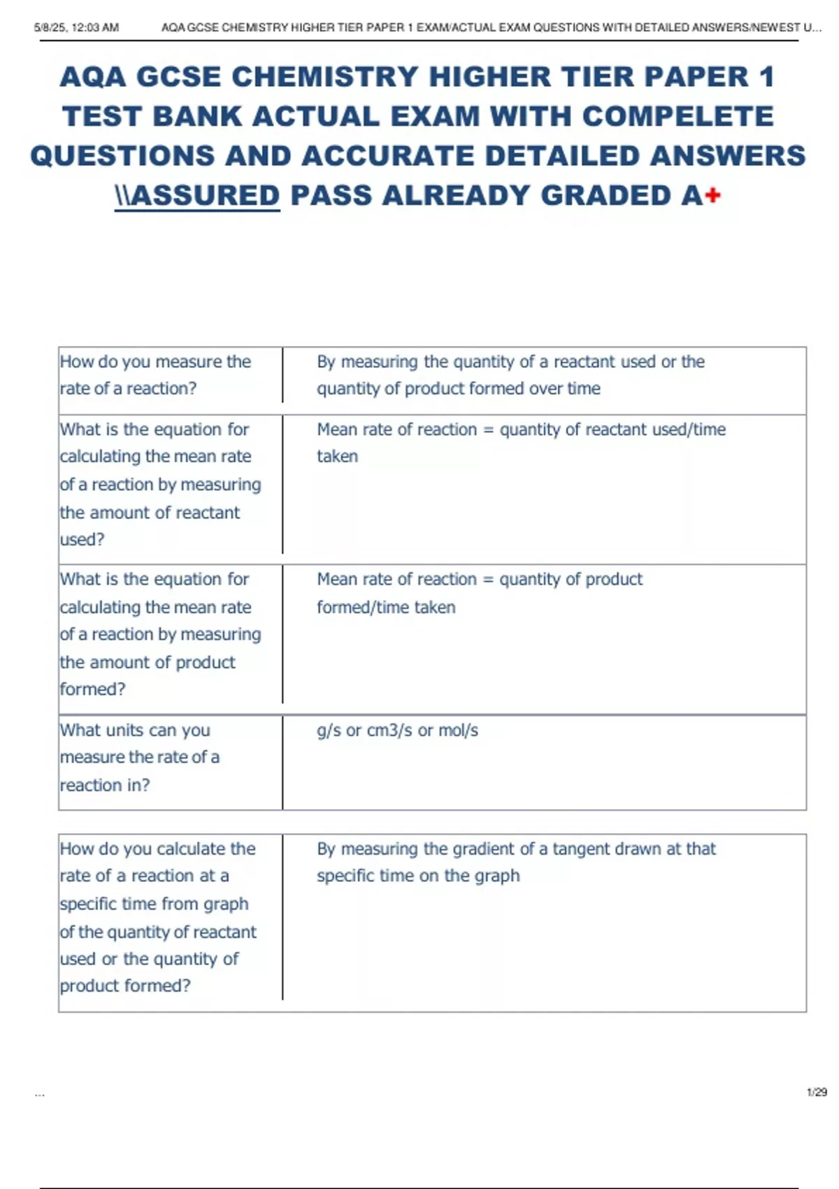 AQA GCSE Chemistry - TEST BANK EXAMS QUESTIONS AND CORRECT DETAILED ANSWERS VERIFIED 100% NEWEST VERSION London South Bank University AQA GCSE Chemistry - TEST BANK EXAMS QUESTIONS AND CORRECT DETAILED ANSWERS VERIFIED 100% NEWEST VERSION London South Bank University