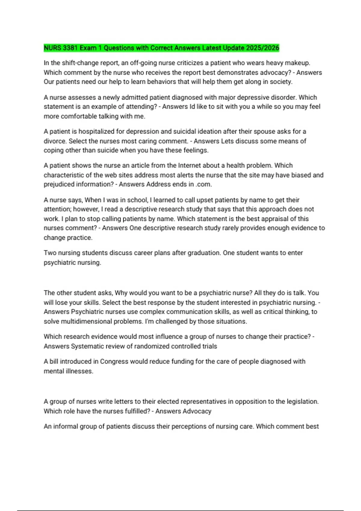 NURS 3381 BUNDLED QUESTIONS WITH CORRECT ANSWERS LATEST UPDATE 2025/2026