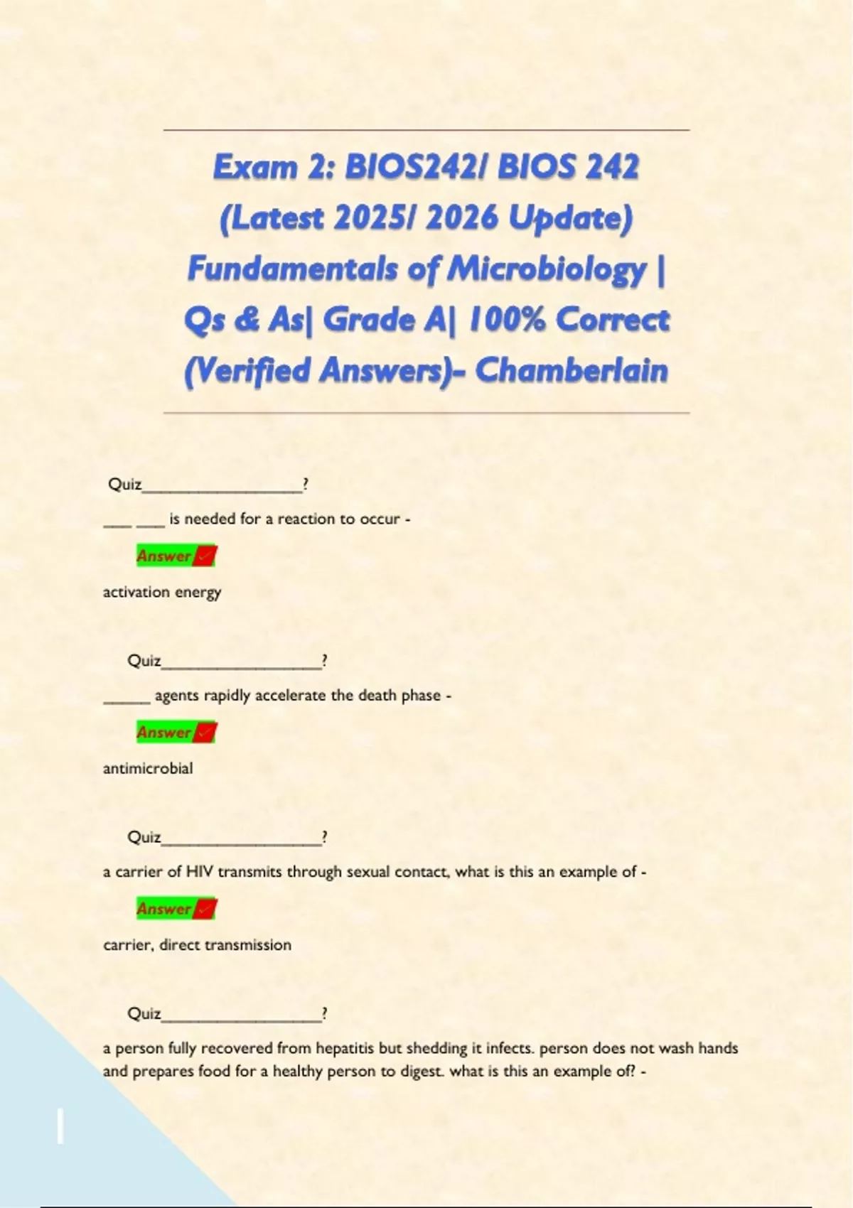 Exam 2: BIOS242/ BIOS 242 (Latest 2025/ 2026 Update) Fundamentals of Microbiology | Qs & As| Grade A| 100% Correct (Verified Answers)- Chamberlain 2 Exam (elaborations) Exam 2: BIOS242/ BIOS 242 (Latest 2025/ 2026 Update) Fundamentals of Microbiology | Qs & As| Grade A| 100% Correct (Verified Answers)- Chamberlain
