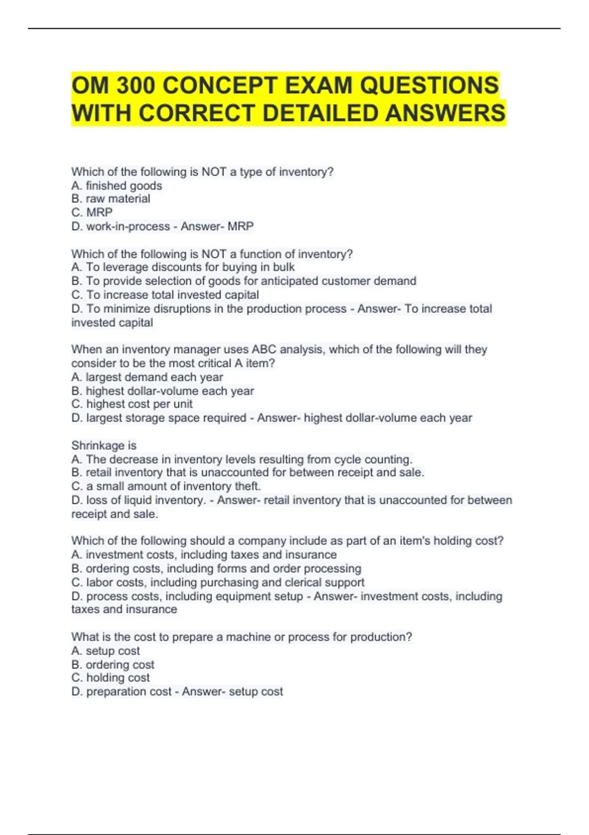 1 Exam (elaborations) OM 300 CONCEPT EXAM QUESTIONS WITH CORRECT DETAILED ANSWERS 2 Exam (elaborations) OM 300 - Test 1 - University of Alabama- Questions with Correct Answers 3 Exam (elaborations) OM 300 Exam 1 Chilcutt Questions with 100% Correct Answers 4 Exam (elaborations) OM 300 FINAL EXAM PREPARATION QUESTIONS WITH COMPLETE SOLUTIONS 5 E