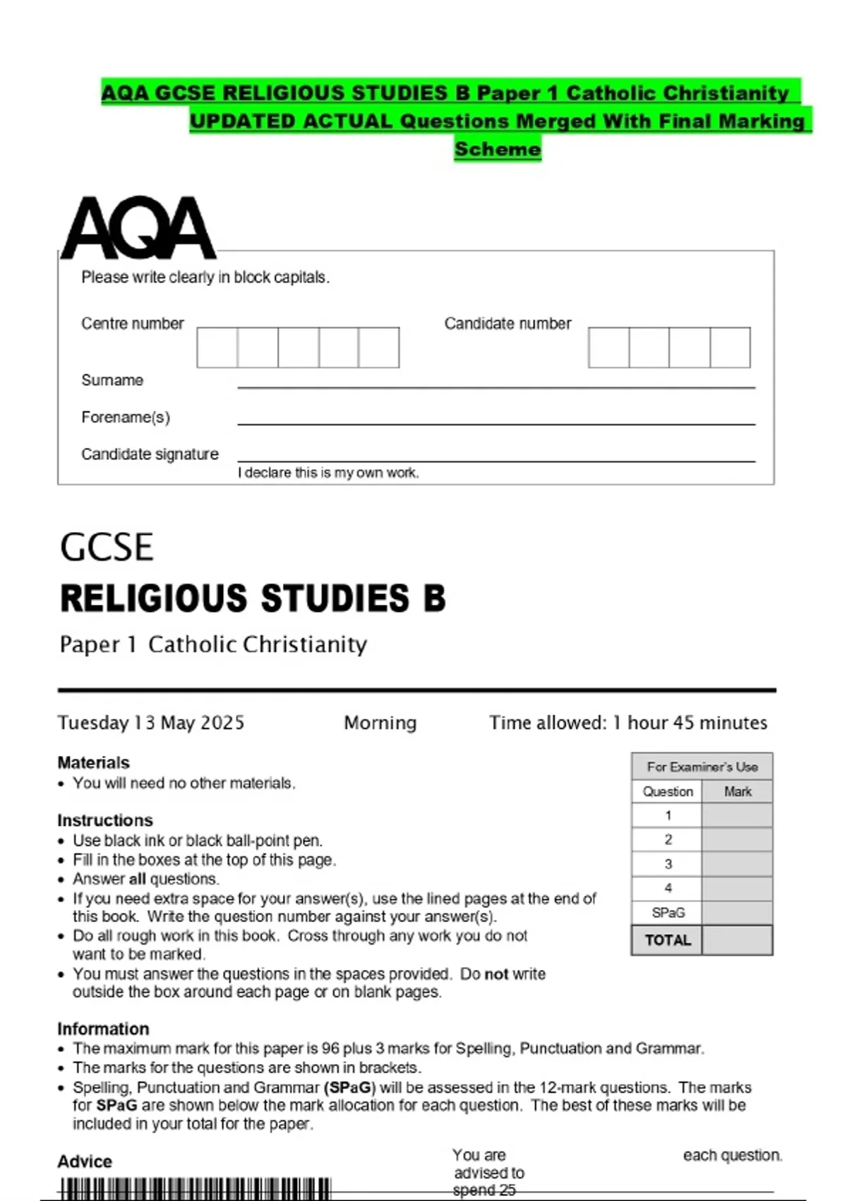 AQA GCSE RELIGIOUS STUDIES B Paper 1 Catholic Christianity UPDATED ACTUAL Questions Merged With Final Marking Scheme