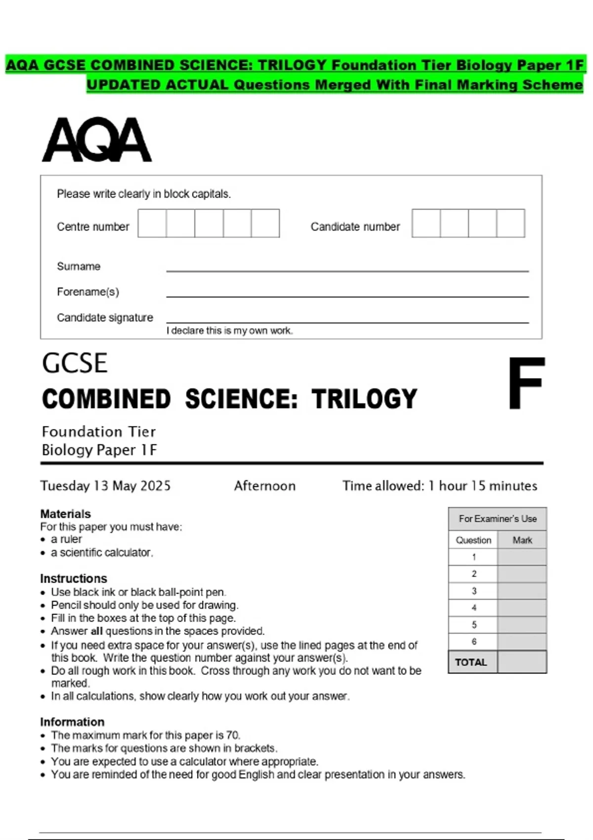 AQA GCSE COMBINED SCIENCE: TRILOGY Foundation Tier Biology Paper 1F UPDATED ACTUAL Questions Merged With Final Marking Scheme