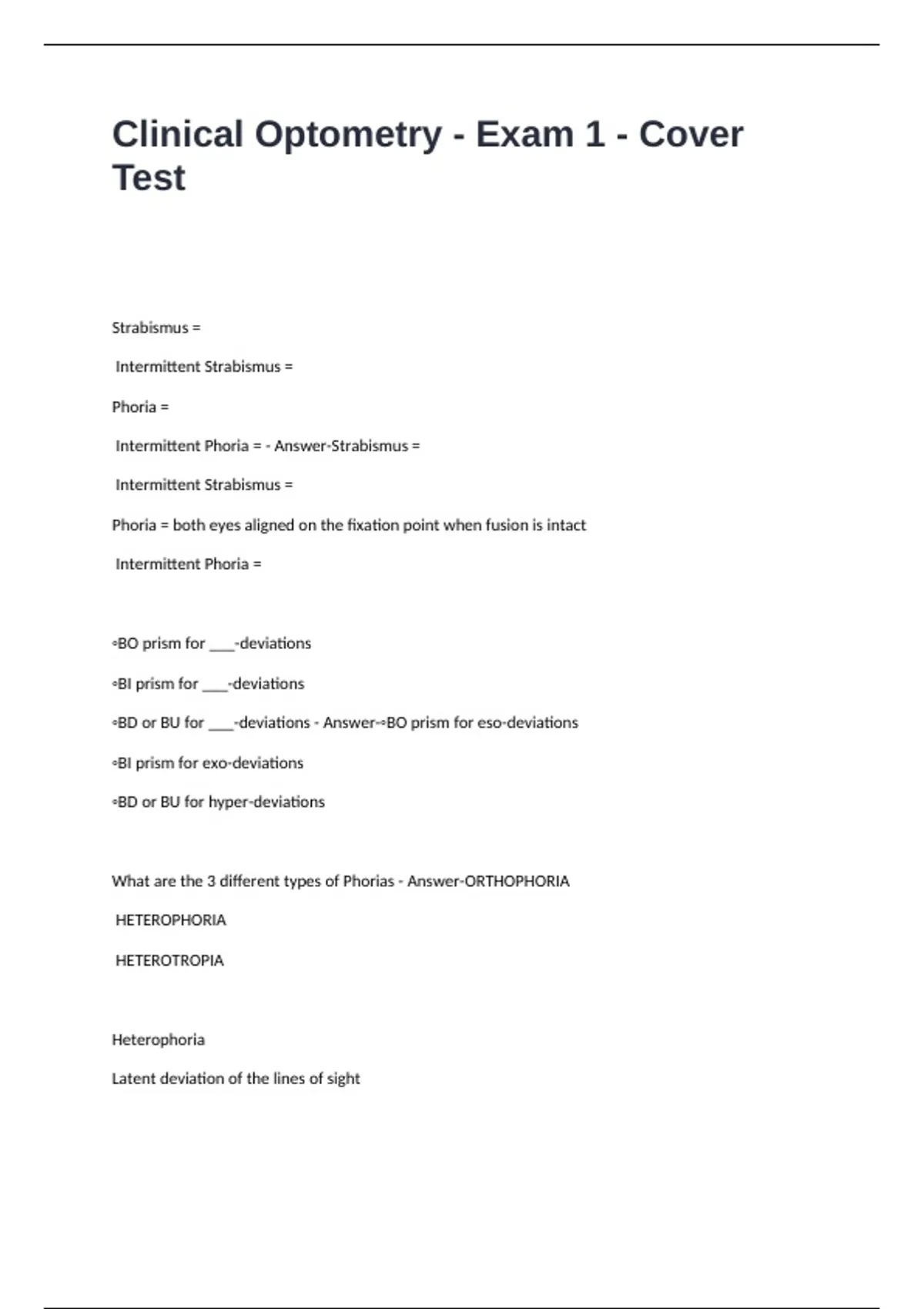 Clinical Optometry - Exam 1 - Cover Test Questions and Answers,Optometry Exam 1 Questions with Correct Answers,Optometry-Exam 1 Questions and Answers.