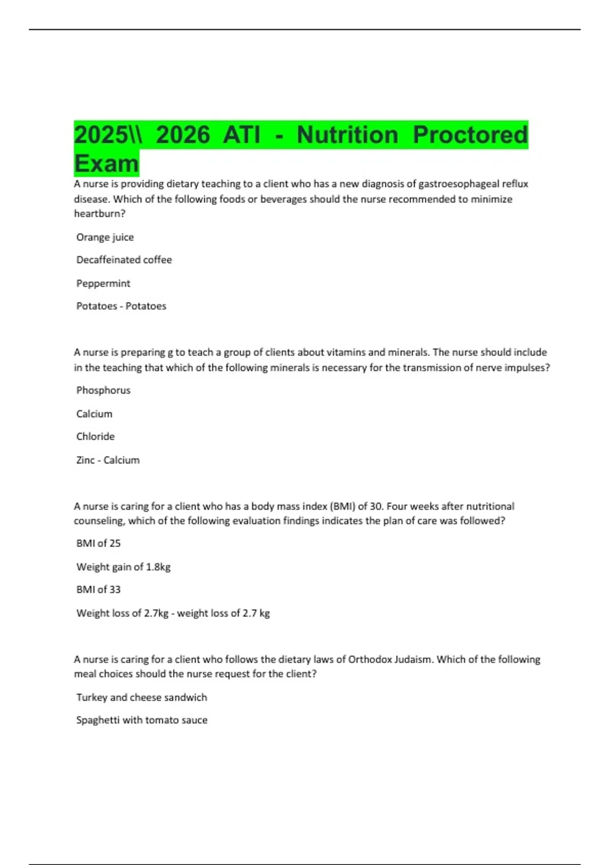 1 Exam (elaborations) ATI - Nutrition Proctored Exam A nurse is providing dietary teaching to a client who has a new diagnosis of gastroesophageal reflux disease. Which of the following foods or beverages should the nurse recommended to minimize heart 2 Exam (elaborations) Understanding Nutrition – Chapter 2: Planning a Healthy Diet (Whi