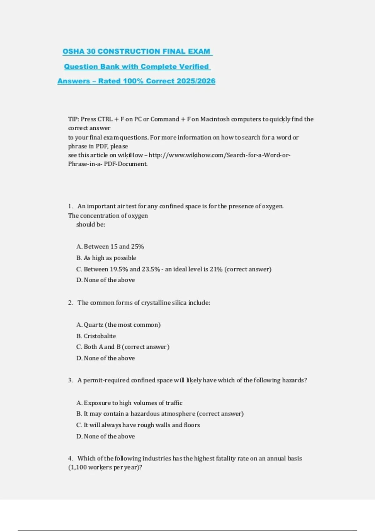 OSHA 30 Construction Final Exam, Occupational Safety and Health Administration, 2025/2026 – question bank with verified answers OSHA 30 Hour Study Guide, Occupational Safety and Health Administration, 2025/2026 – latest exam questions with revised answers OSHA 30 Final Exam, Occupational Safety and Health Administration, 2025/2026 – certified exam