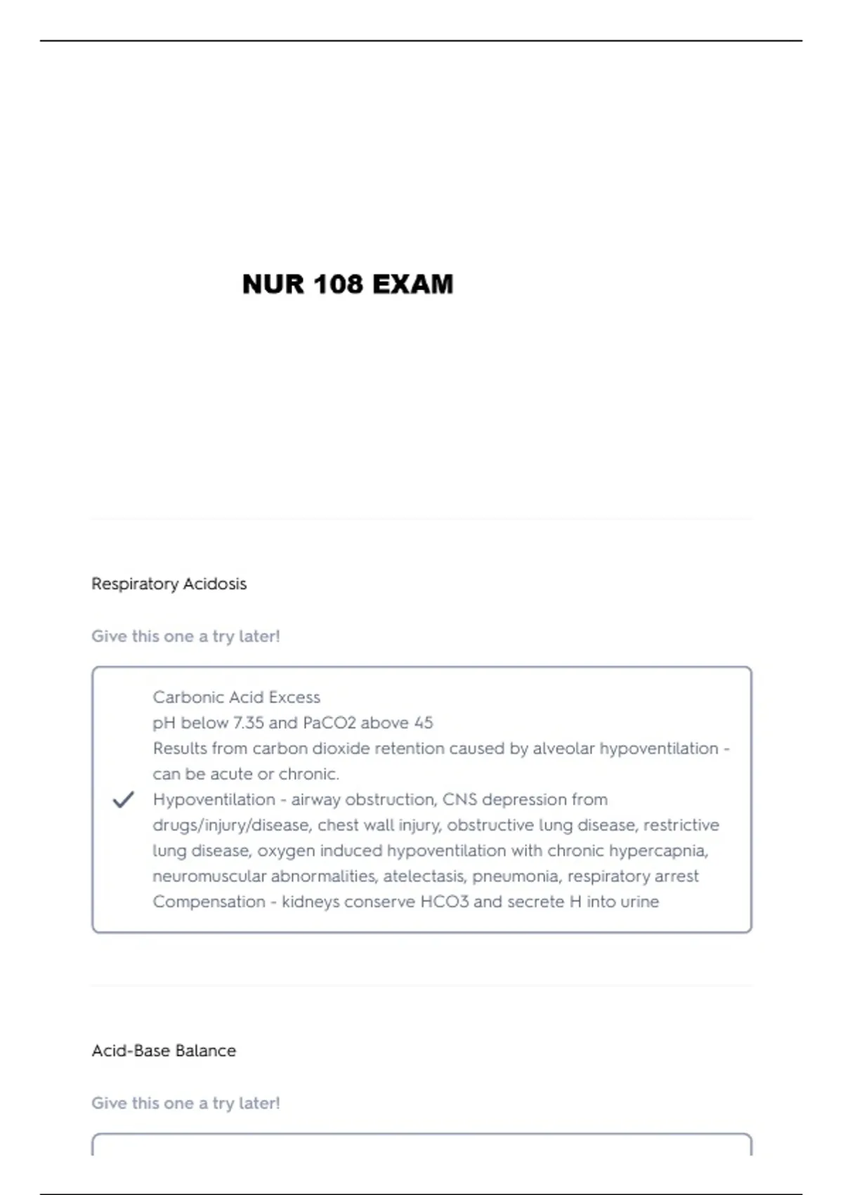 NUR 108 ACID-BASE BALANCE QUESTIONS AND VERIFIED ANSWERS