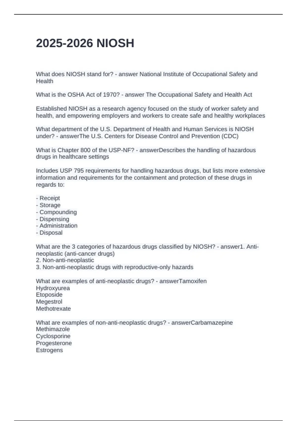 Exam (elaborations) USP Chapter 800 Hazardous Drugs in Healthcare Settings Questions and Answers Correct Exam (elaborations) Toxicological hazards Questions and Answers Exam (elaborations) SQ. Medications, Hazardous (Pre-Assessment) Questions and Answers Exam (elaborations) NIOSH QUESTIONS WITH CORRECT ANSWERS Exam (elaborations) NIOSH Web