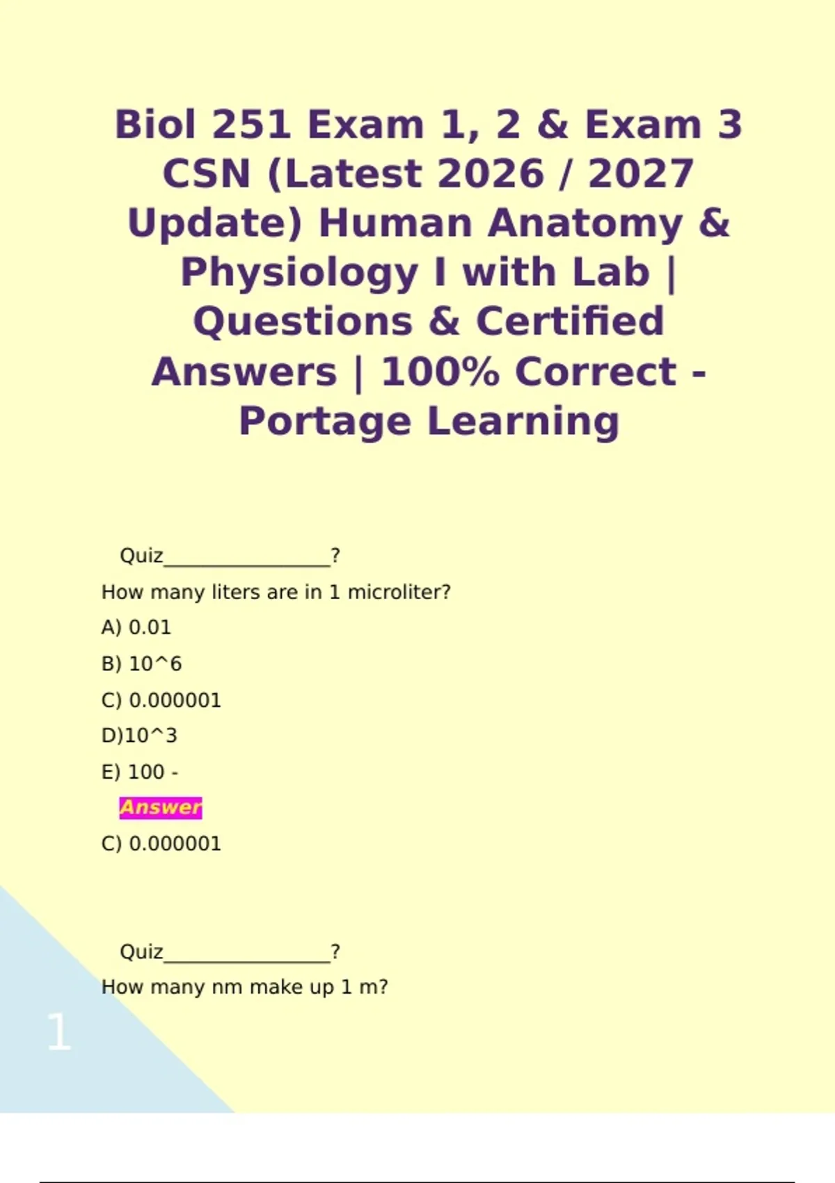 BIOL 251 Exam Lab1, 2 & 3 : (Latest 2026 / 2027 Update) Human Anatomy & Physiology I with Lab BUNDLE | Questions & Certified Answers | 100% Correct - Portage Learning