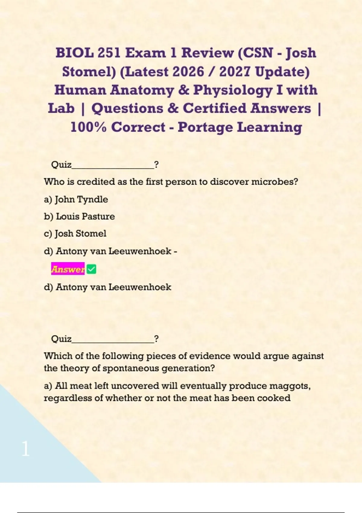 1 Exam (elaborations) BIOL 251 Exam 1 Review (CSN - Josh Stomel) (Latest 2026 / 2027 Update) Human Anatomy & Physiology I with Lab | Questions & Certified Answers | 100% Correct - Portage Learning 2 Exam (elaborations) BIOL 251: Exam 3 (Latest 2026 / 2027 Update) Human Anatomy & Physiology I with Lab | Questions & Certified Answers | 100% Correct