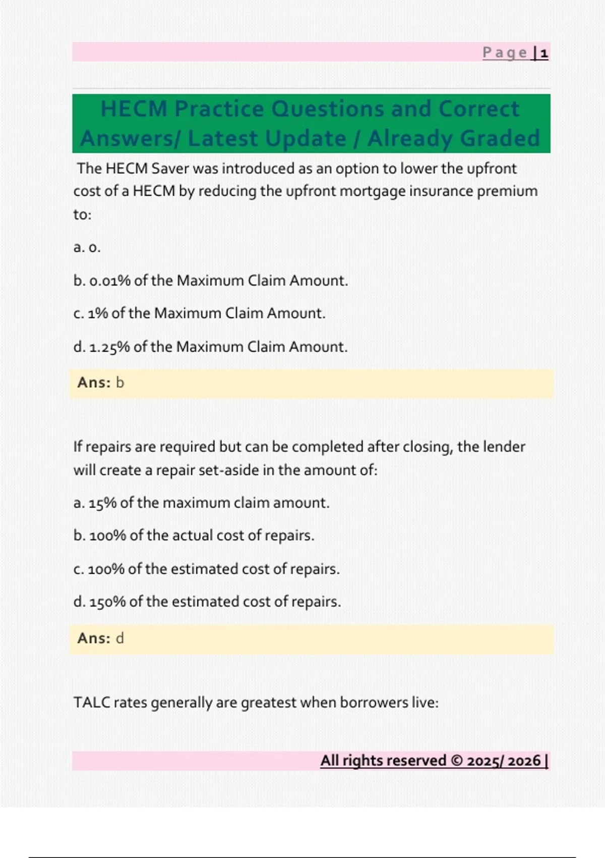HECM Questions and Correct Answers/ Latest Update / Already Graded