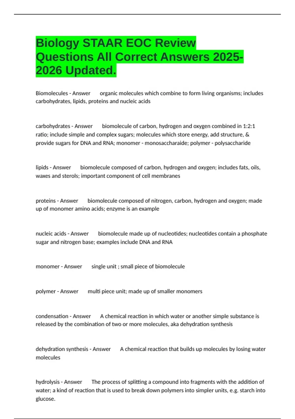 1 Exam (elaborations) STAAR Biology FULL REVIEW Questions And All Correct Answers Updated. 2 Exam (elaborations) Grade 12 Biology Exam Review Questions and Already Passed Answers Updated. 3 Exam (elaborations) Biology Review Exam and All Correct Answers Updated.