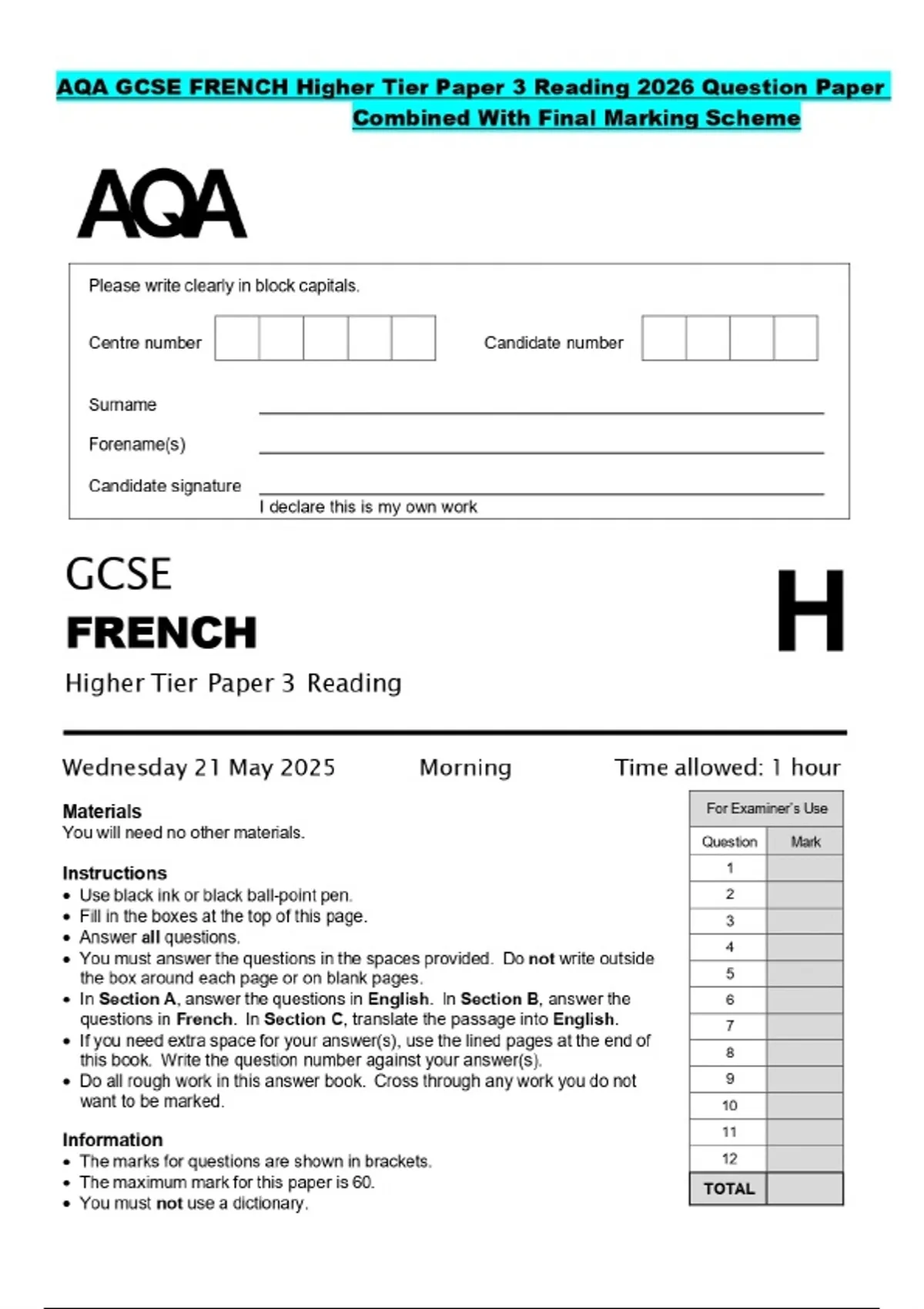 AQA GCSE FRENCH Higher Tier Paper 3 Reading 2026 Question Paper Combined With Final Marking Scheme