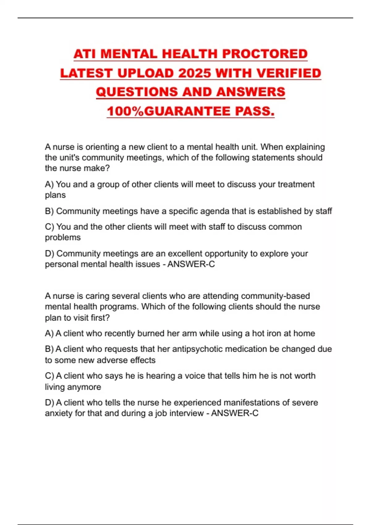 ATI MENTAL HEALTH PROCTORED LATEST UPLOAD 2025 WITH VERIFIED QUESTIONS AND ANSWERS 100%GUARANTEE PASS.